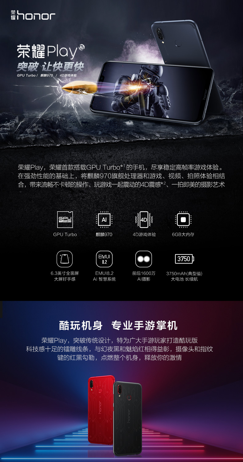 荣耀/Honor 荣耀play全网通青春学生游戏手机荣耀双摄智能机paly年轻人手机