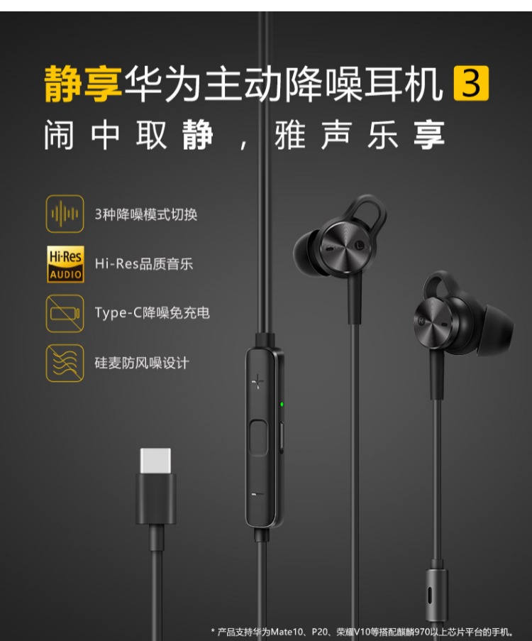 商品名称:华为/Huawei 主动降噪耳机3 适用mate10 p20 type-c接口入耳式耳机