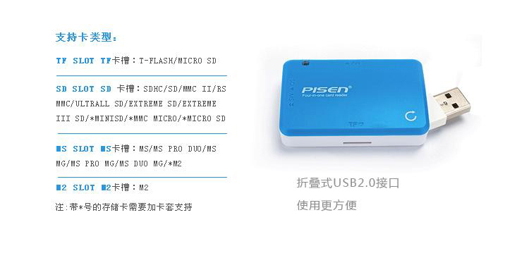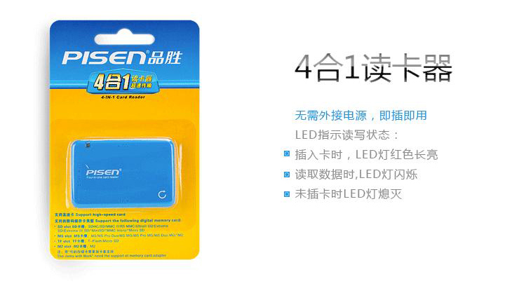 商品名称:Pisen/品胜 多功能4合1读卡器 TF/SD/MS/M2直接读取