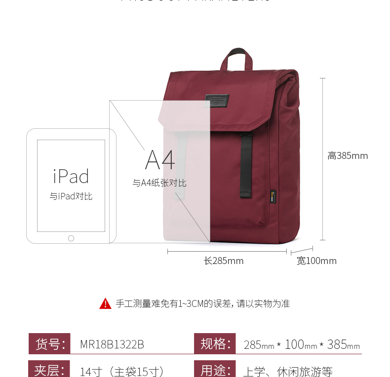 商品名称:Mr.ace Homme 双肩包女韩版大容量中学生书包简约电脑背包15寸旅行