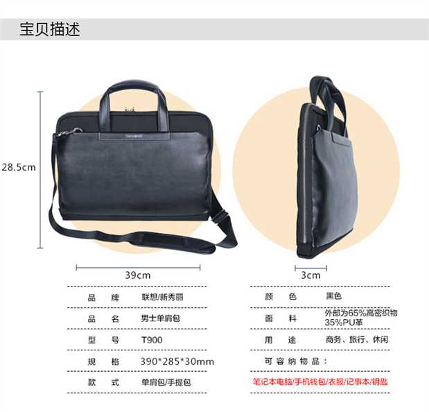 商品名称:国产 T900商务单肩手提包轻薄经典时尚商务黑笔记本电脑公文包