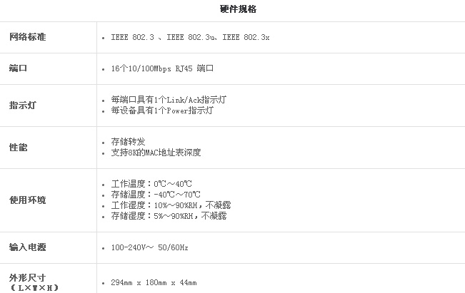 提供16个10/100M自适应RJ45端口,所有端口均可实现线速转发;