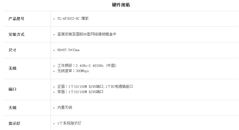 商品名称:TP-LINK TL-AP302I-DC 供电 无线入墙面板式网络86型酒店WIFI覆盖