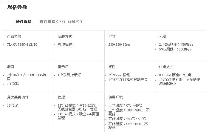 商品名称:TP-LINK TL-AP1758GC-PoE/DC 1750M双频无线吸顶式AP酒店商场
