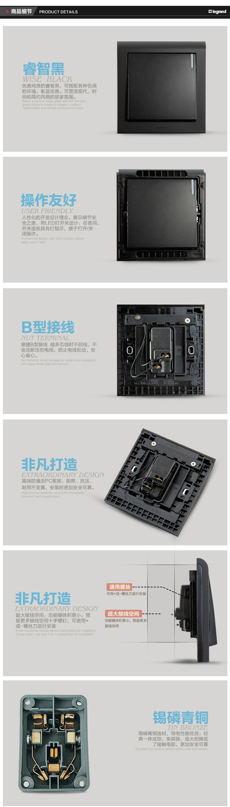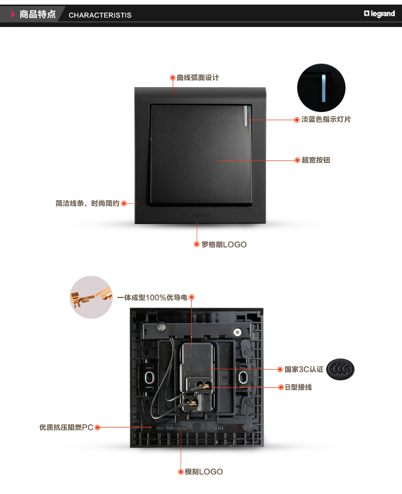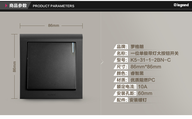 商品名称:罗格朗 黑色家用单开双控1开一位一灯双控开关面板楼梯86型单联