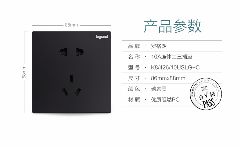 商品名称:罗格朗 黑色五孔插座开关面板家用86型5孔墙壁电源暗装碳素黑