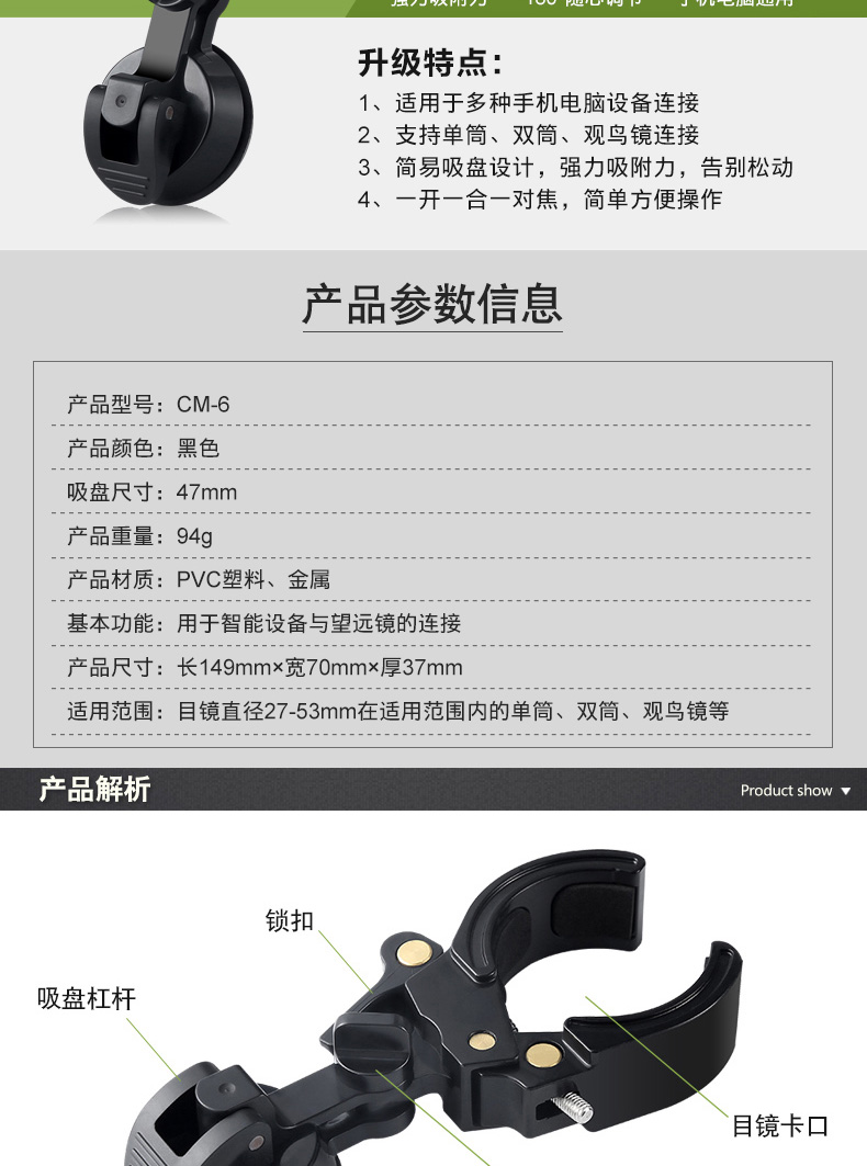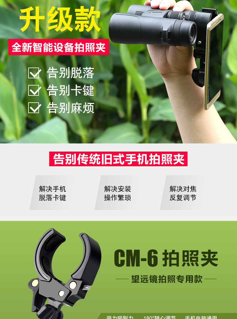 商品名称:国产 手机连接单双筒望远镜天文观鸟显微镜万能拍照摄像夹子支架配件 CM-6