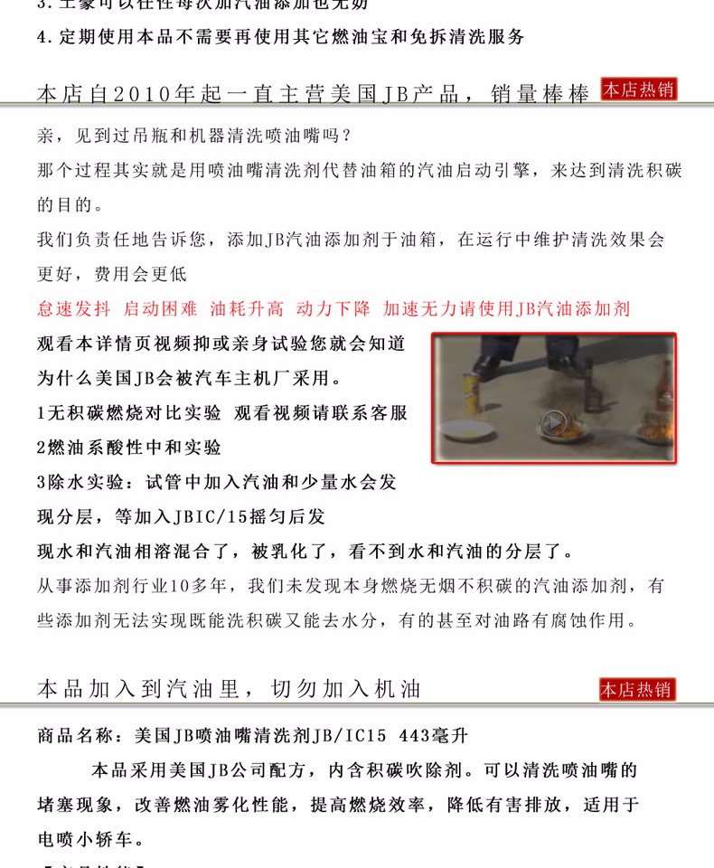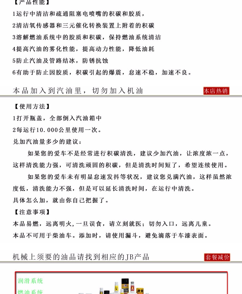商品名称:JB 喷油嘴清洗剂除积碳除水剂积碳清洗保护剂燃油宝汽油添加剂
