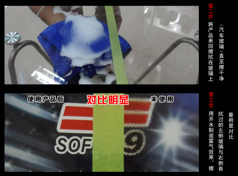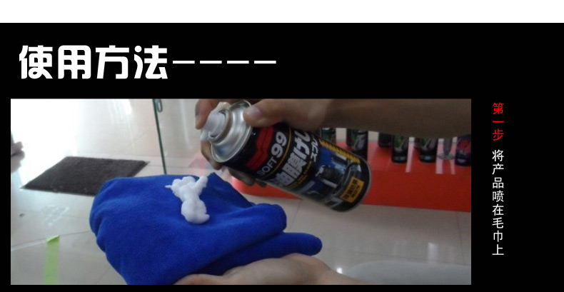使用于车内玻璃及车外后视镜时:直接喷射适量到玻璃上后、用干燥干净的软毛巾将泡沫擦开并擦拭干净。