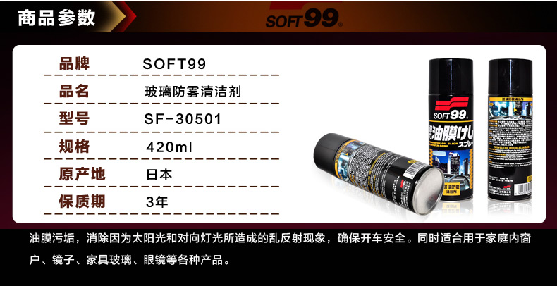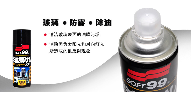 车外清洁去污功能:本品使用于车外挡风玻璃上、可以清洁玻璃表面的油膜污垢、消除因为太阳光和对向灯光所造成的乱反射现象。同时适合用于家庭内的窗户、镜子、家具玻璃、眼睛等各种产品。