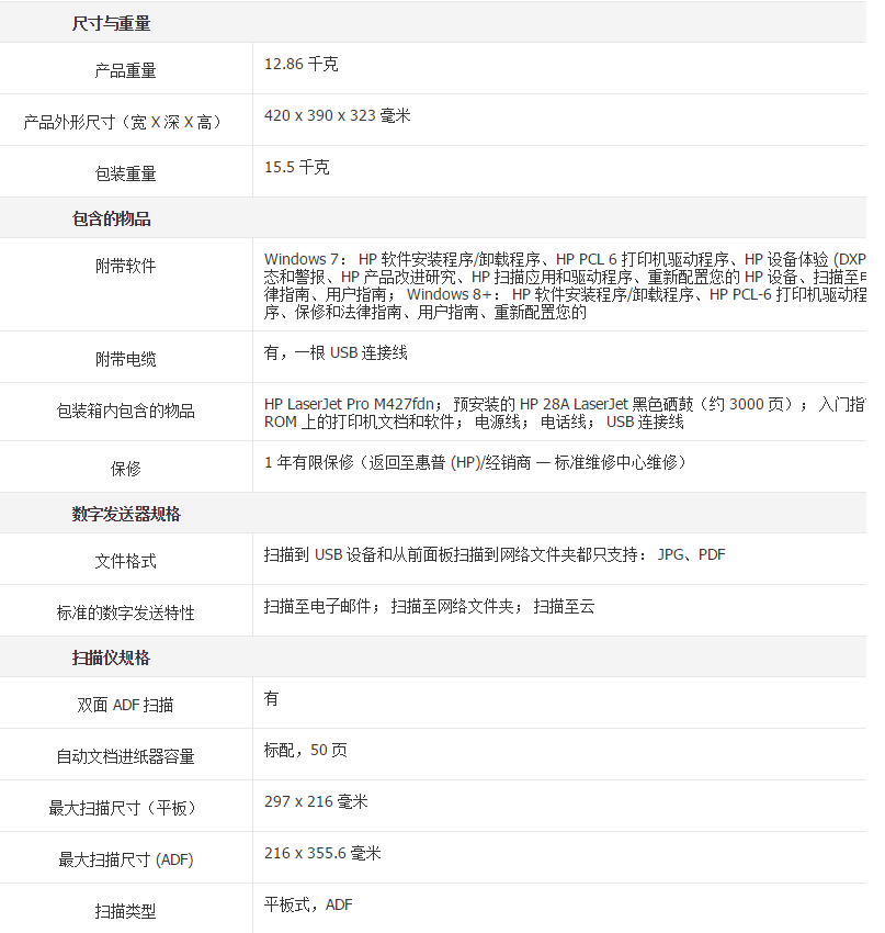 商品名称:惠普/HP 黑白激光一体机打印复印扫描传真 M427FDN