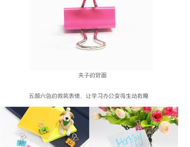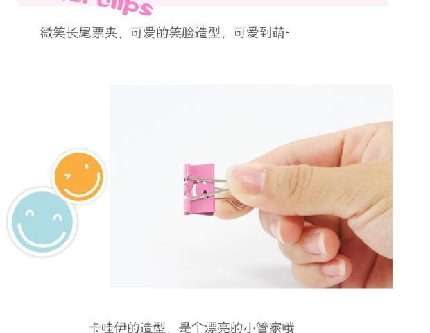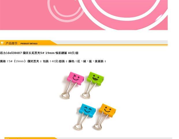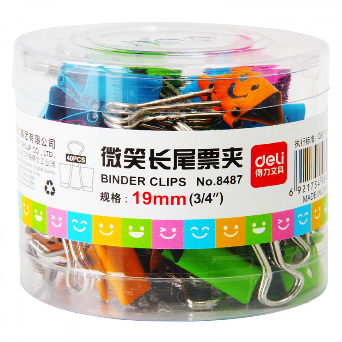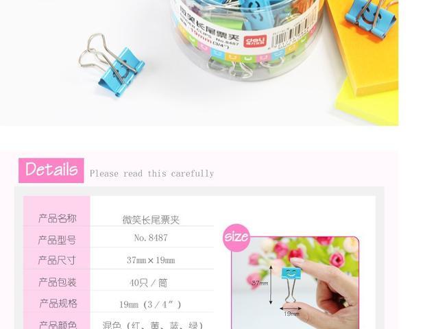 商品名称:得力 微笑长尾票夹5号 19mm 悦彩靓丽 40只/筒 金属票夹子燕尾夹
