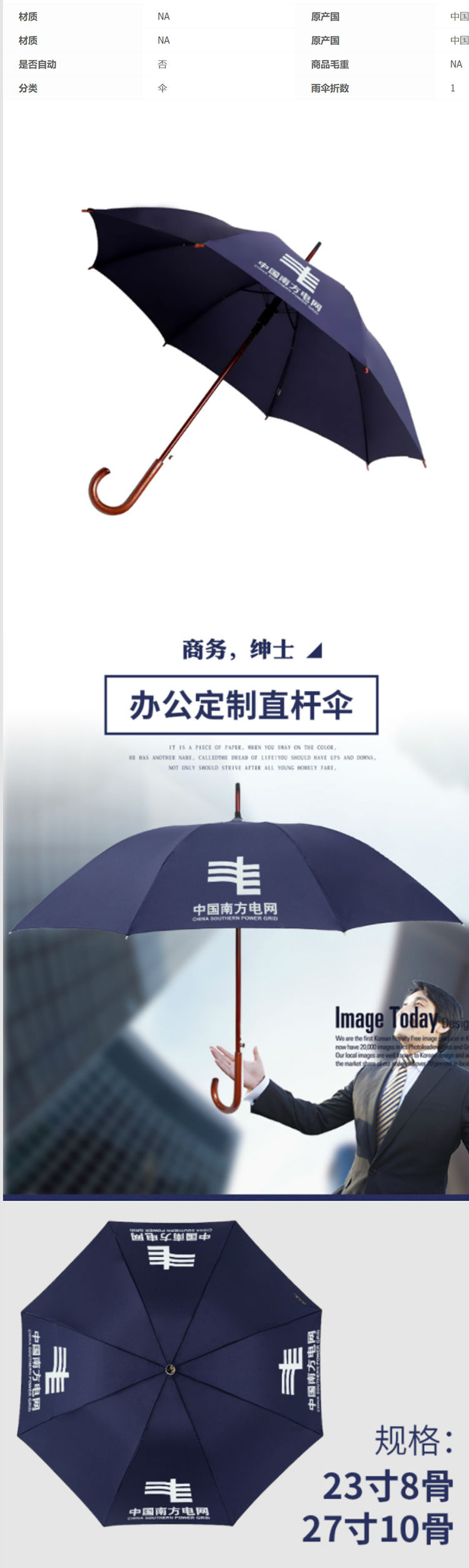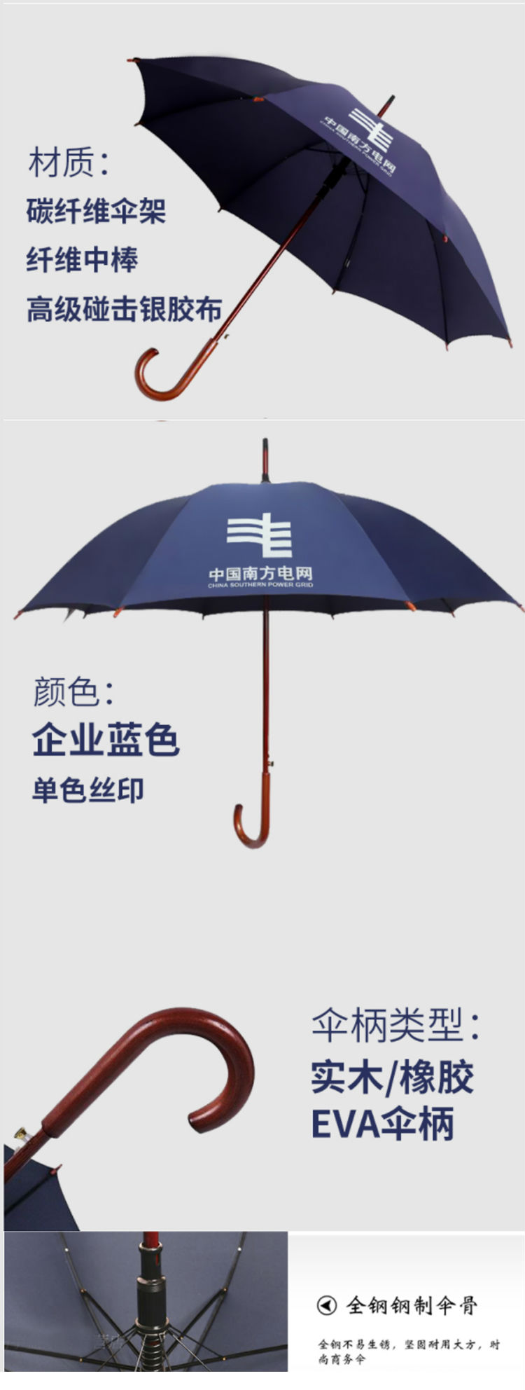 国产 南方电网 办公VI订制品 直杆伞 (23寸)(200把起订) 23寸碳纤维伞架8骨,纤维中棒;实木/橡胶/EVA伞柄;高级碰击银胶布