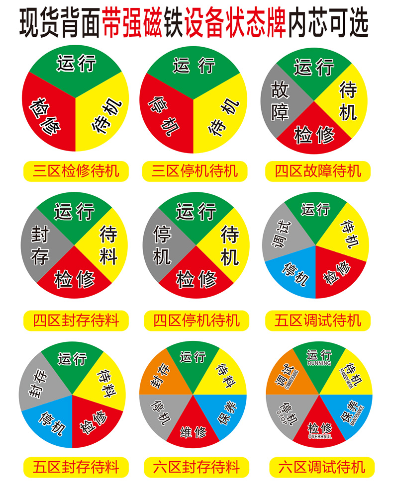 商品名称:国产 圆形设备状态标识牌带3M胶强磁铁旋转工厂机器设备管理指示牌运行待机开关机台维修管理牌 可定做
