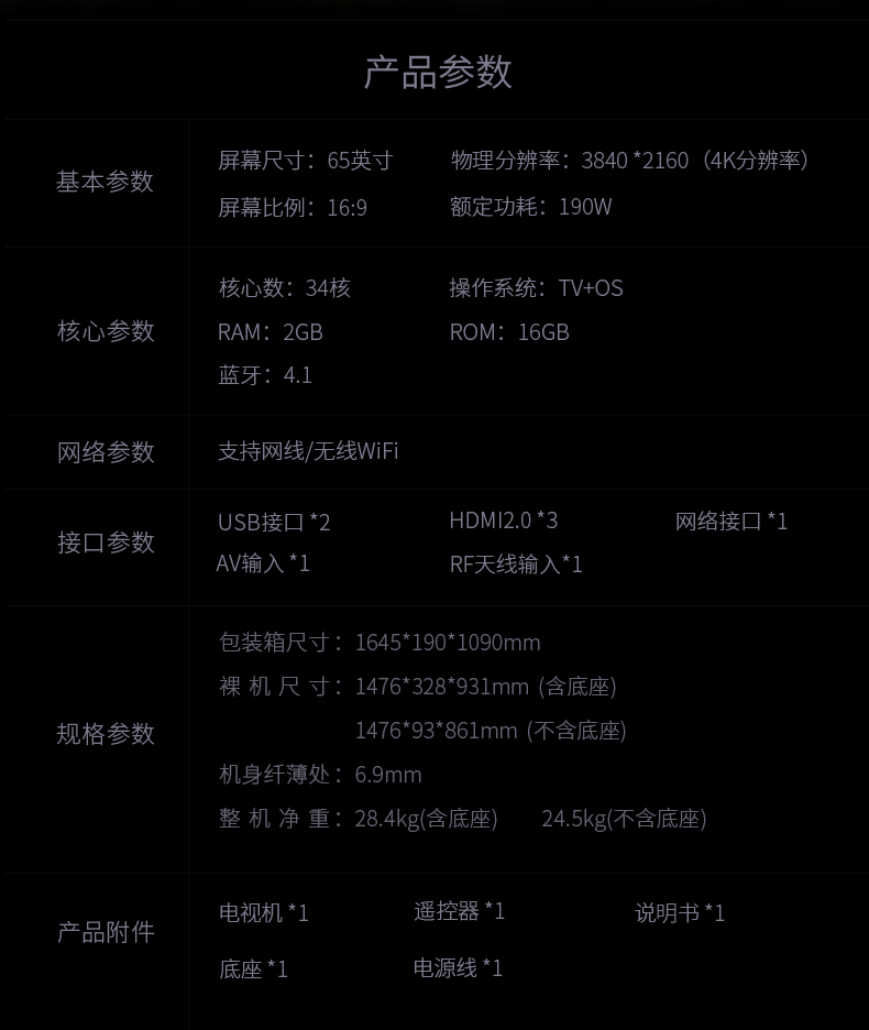 商品名称:TCL 65英寸无边框全面屏人工智能LED液晶电视 65Q2