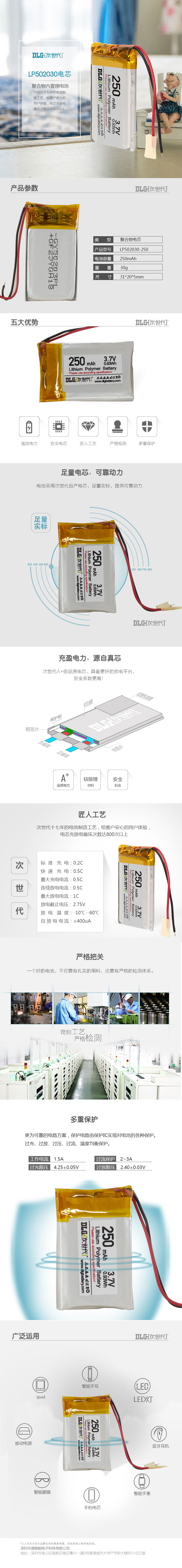 商品名称:次世代 3.7V 聚合物锂电池 LP502030-250mAh