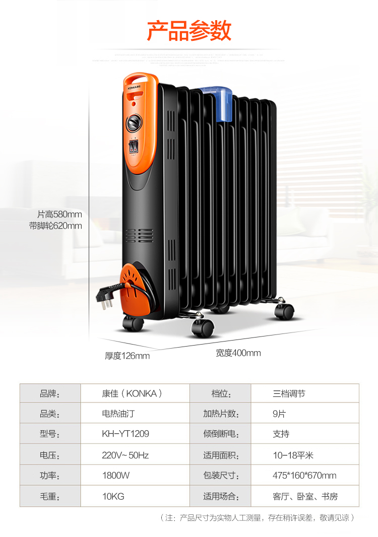 商品名称:康佳 9片家用电热油汀取暖器/电暖器/电暖气 KH-YT1209