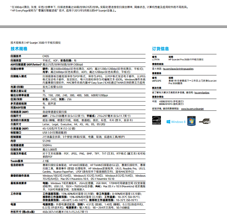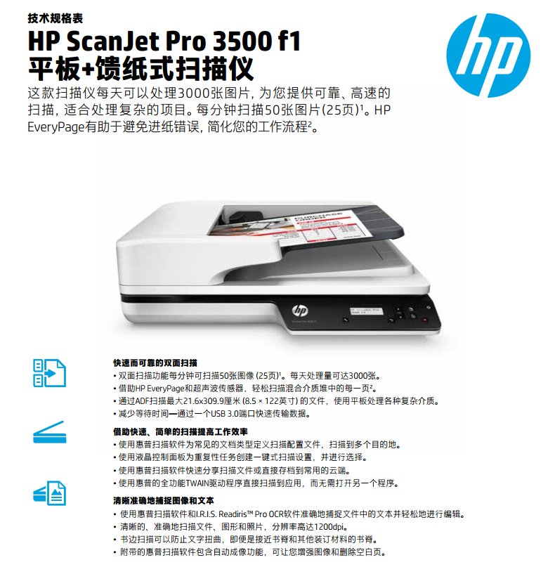 商品名称:惠普/HP 平板+馈纸式扫描仪 ScanJet Pro 3500 f1