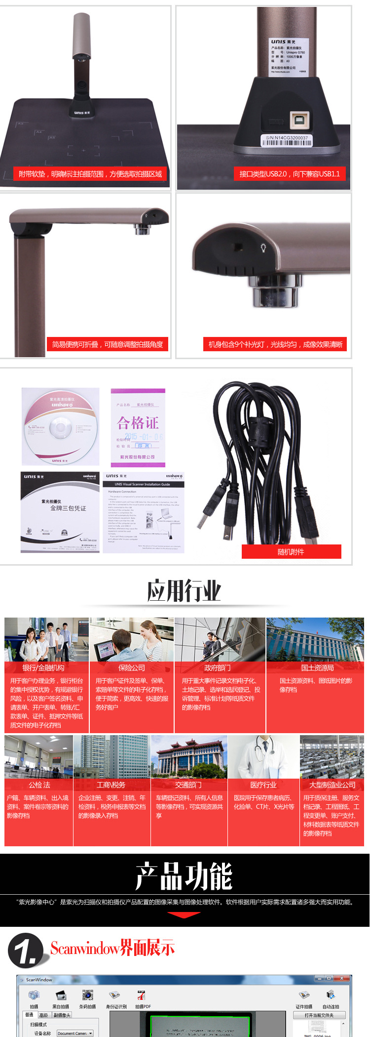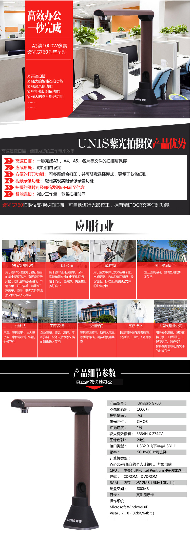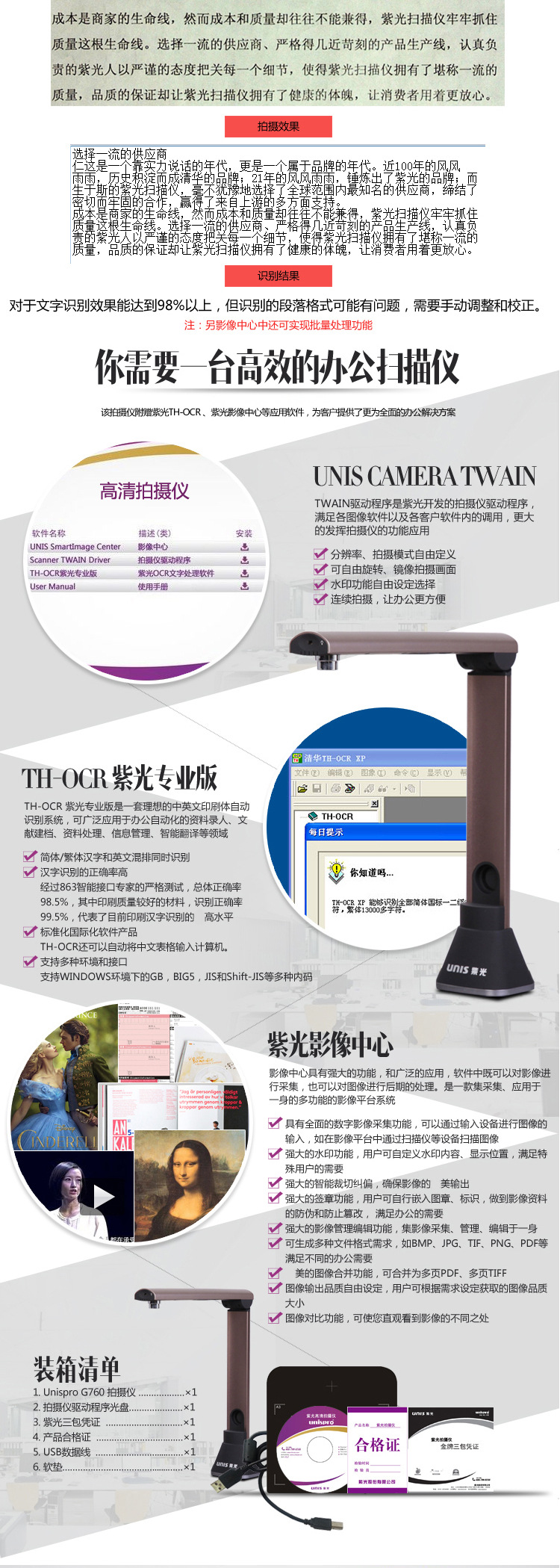 商品名称:清华紫光 高拍仪A3便携式扫描仪高清1000万像素拍摄文件翻拍仪 G760