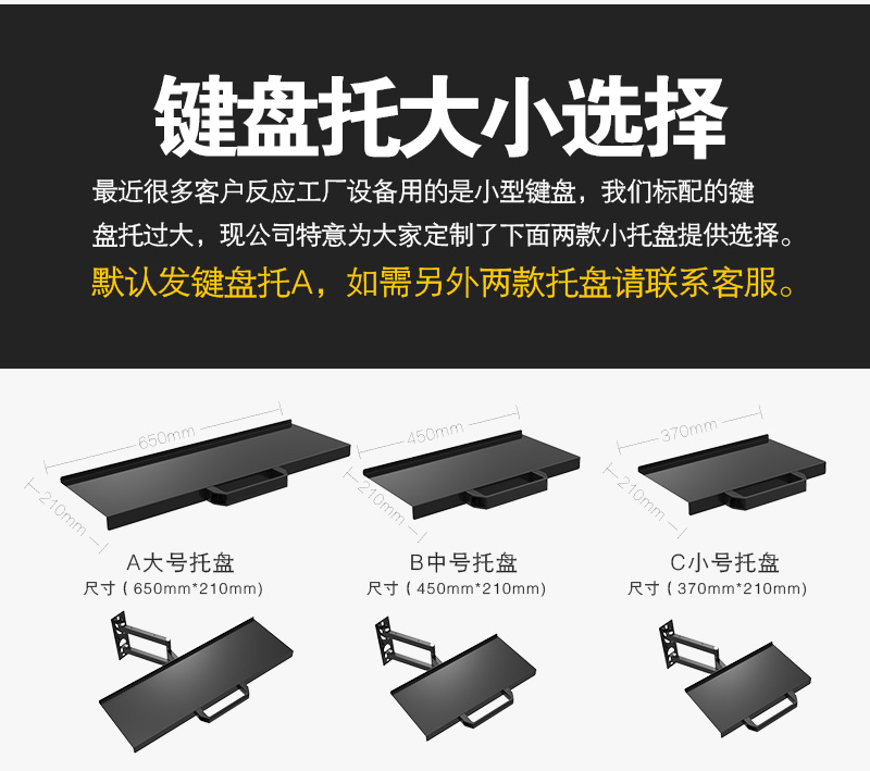 产品特点: 悬臂式键盘托盘支架是适用于与LCD,LED和液晶显示屏配套的挂栽支持。适合在家庭和商务等各种场所使用。它易于安装特性,高强度不锈钢板冲压托盘结构+航空铝合金臂结构与流线型的外观设计相结合,既节约空间又美观,展示给您视觉与操作效果。悬臂型支架可调技术,可以满足你的不同操作要求。