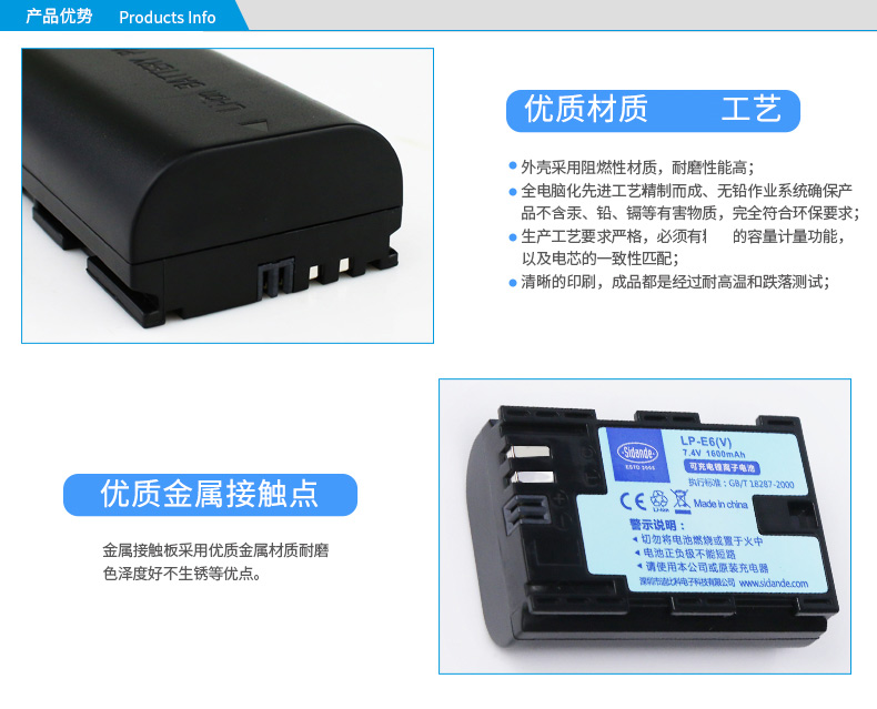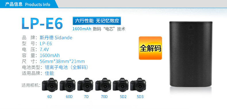 商品名称:斯丹德 LP-E6 lpe6佳能单反相机5d2 5D3 6D 7D 60D 70D非原装电池
