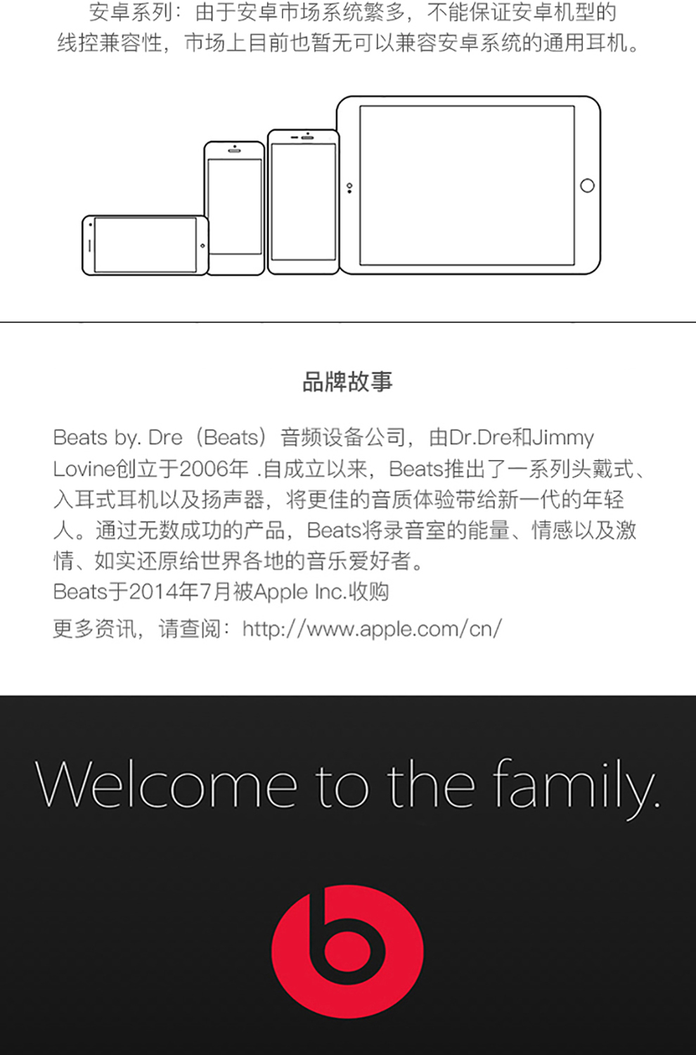 Beats by Dr. Dre (Beats)是音频设备公司,由Dr. Dre 和 Jimmy lovine创立于2006年。自成立以来,Beats 推出了一系列头戴式、入耳式耳机以及扬声器,将愉悦的音质体验带给新一代的年轻人。通过产品,Beats 将录音室里的能量、情感以及激情, 如实传递给世界各地的音乐爱好者。Beats于2014年7月被Apple Inc.收购。
