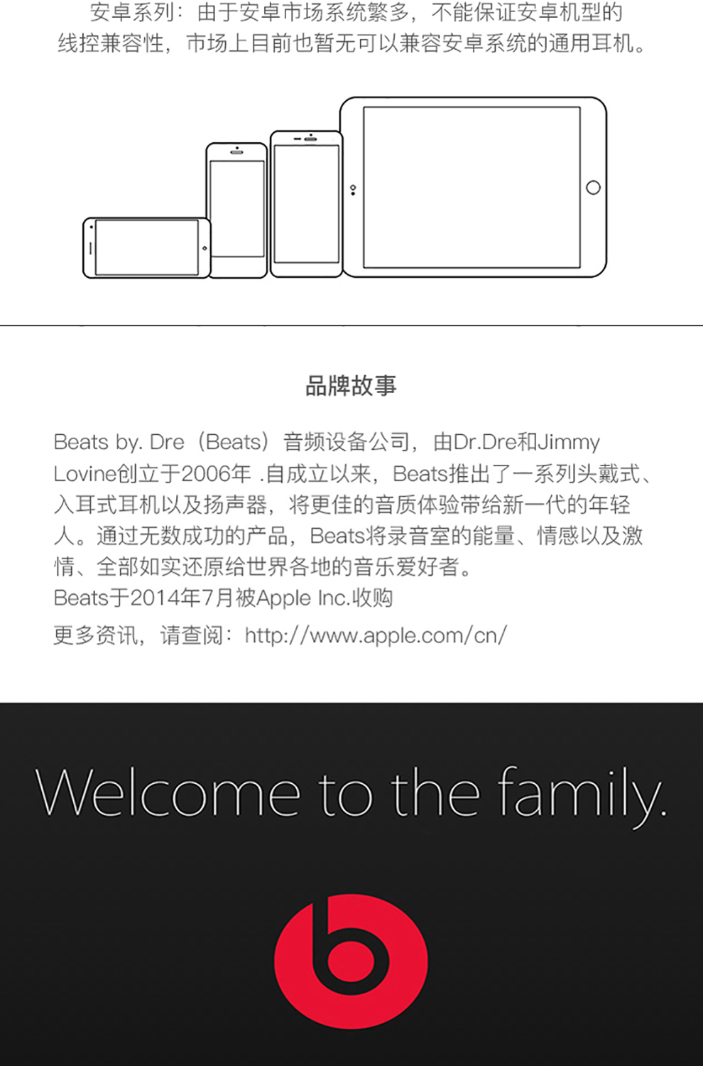 Beats by Dr. Dre (Beats)是音频设备公司,由Dr. Dre 和 Jimmy lovine创立于2006年。自成立以来,Beats 推出了一系列头戴式、入耳式耳机以及扬声器,将愉悦的音质体验带给新一代的年轻人。通过产品,Beats 将录音室里的能量、情感以及激情, 如实传递给世界各地的音乐爱好者。Beats于2014年7月被Apple Inc.收购。