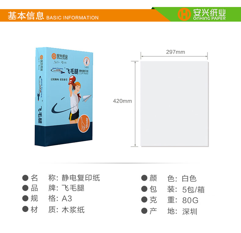商品名称:安兴纸业 飞毛腿复印纸a3纸打印80g纸500张白色80g克