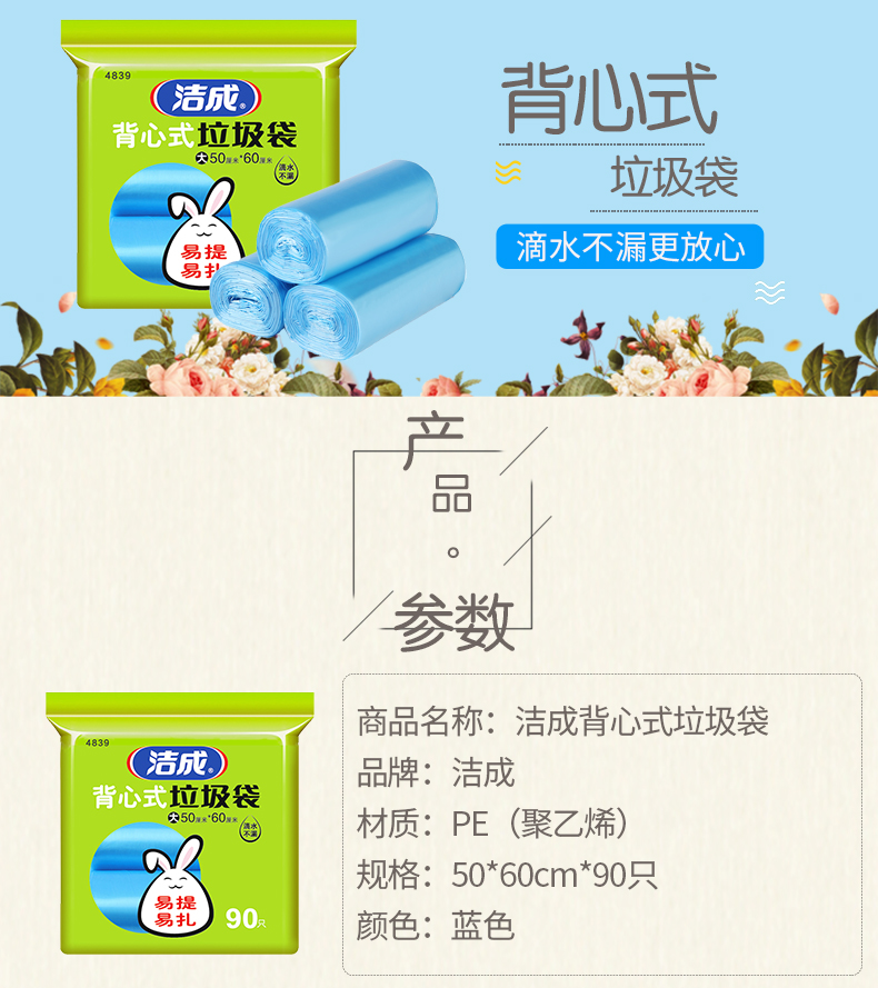商品名称:洁成 垃圾袋一次性家用加厚手提背心式大号90只袋子 4839