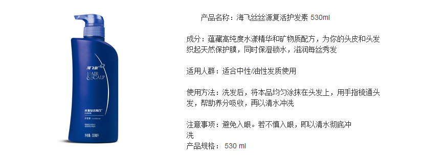 商品名称:海飞丝 洗发水+护发素套装丝源复活男女头皮保湿530ml