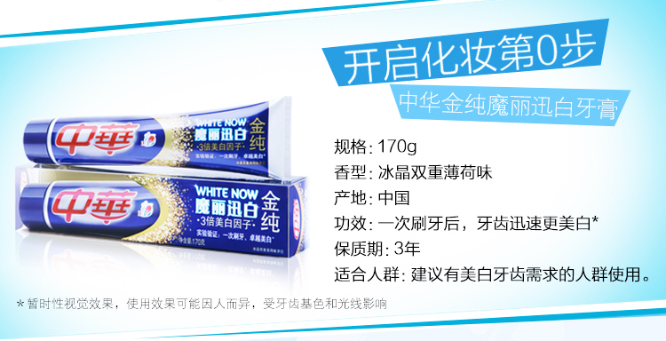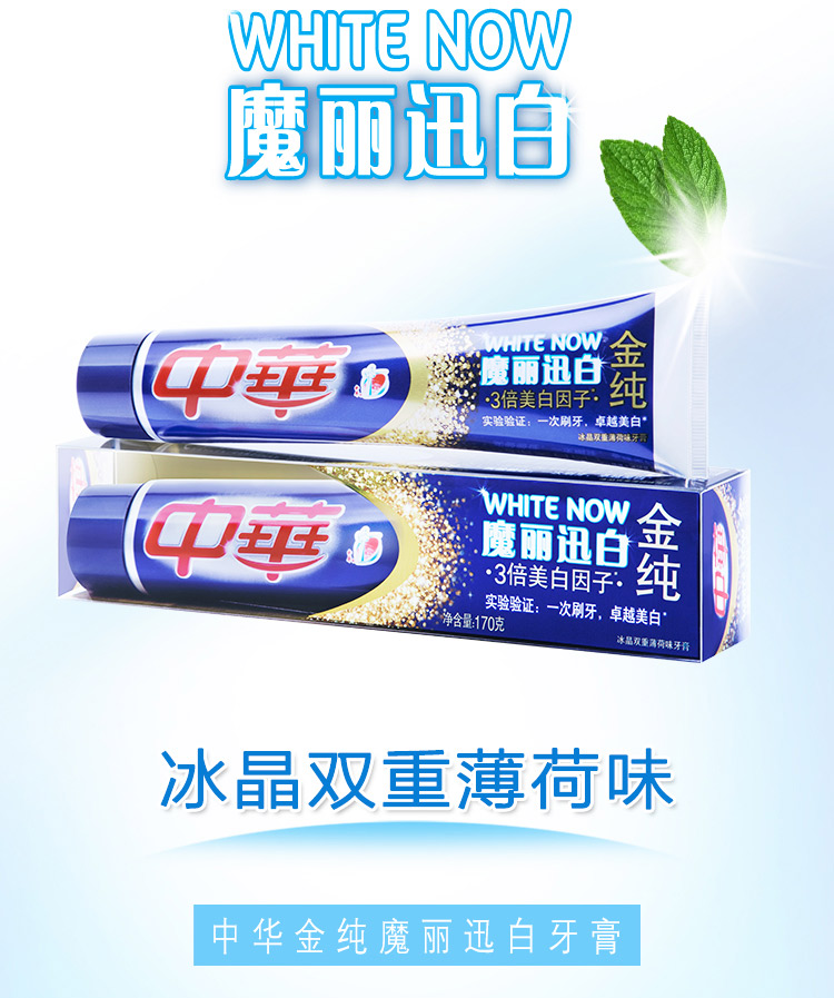 商品名称:中华 金纯魔丽迅白冰晶双重薄荷味牙膏100g/170g