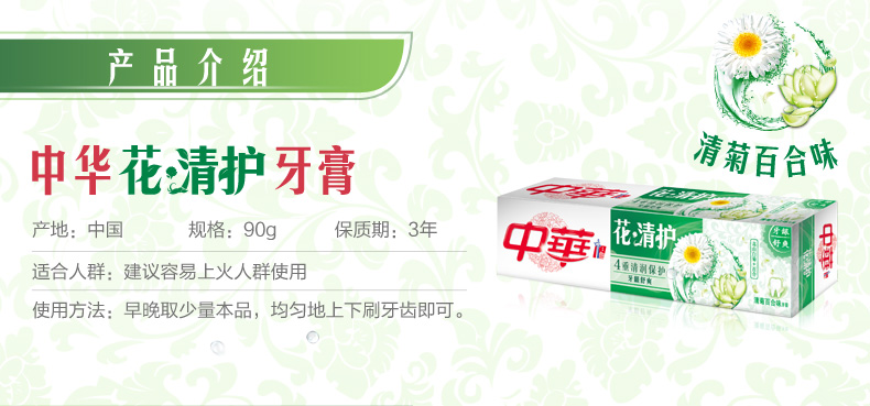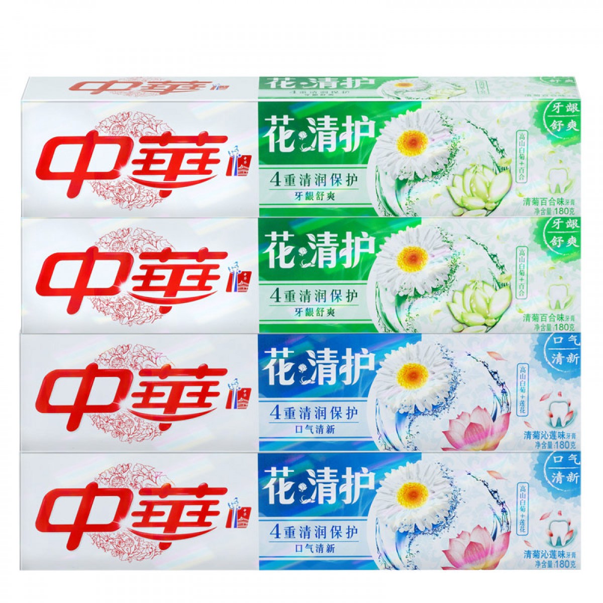 商品名称:中华 花清护 清菊百合味+清菊沁莲味牙龈舒爽四支装