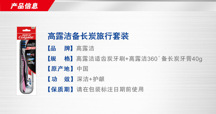 商品名称:高露洁 备长炭旅行套装深洁护龈适齿炭牙刷+360长炭薄荷香牙膏40g