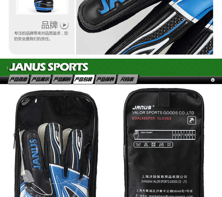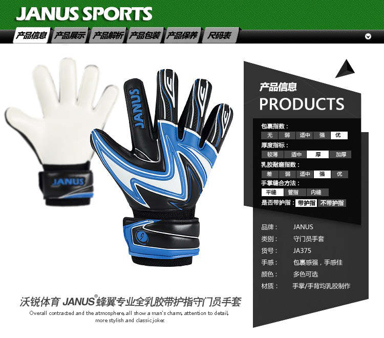 商品名称:JANUS 蜂翼系列 专业全乳胶 带护指 守门员手套 门将手套 JA375