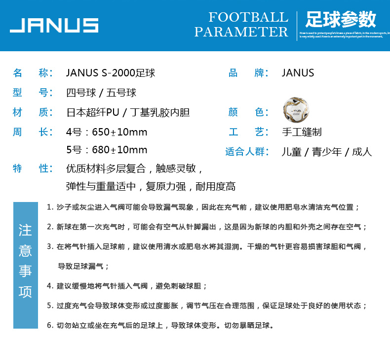 商品名称:JANUS 儿童足球4号训练青少年日本超纤5号成人比赛手缝足球S-2000