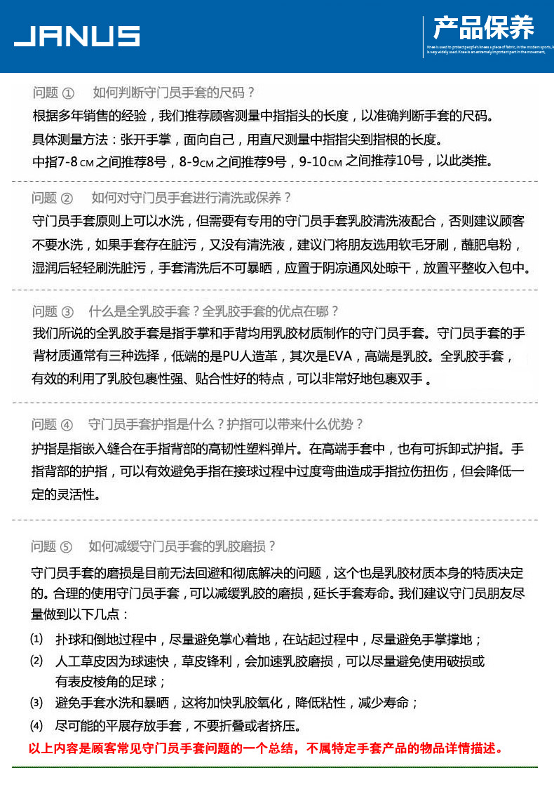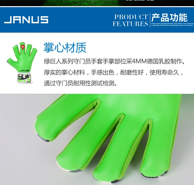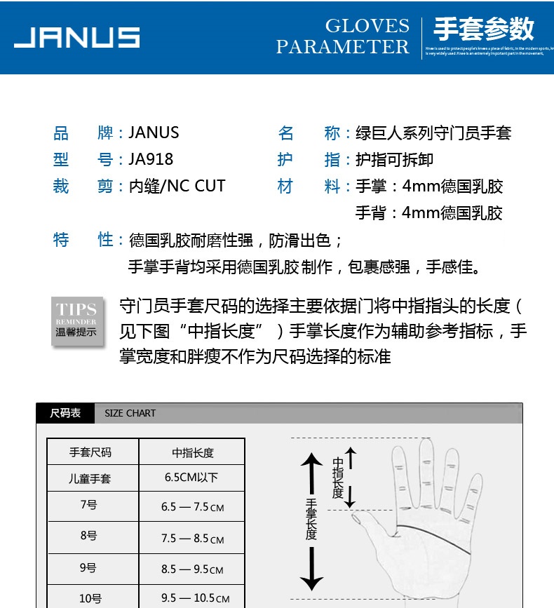商品名称:JANUS 全乳胶护指可拆卸 内缝 成人足球守门员手套门将手套 JA918