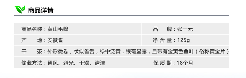 商品名称:张一元 黄山毛峰 新茶 春茶茶叶安徽绿茶 125g