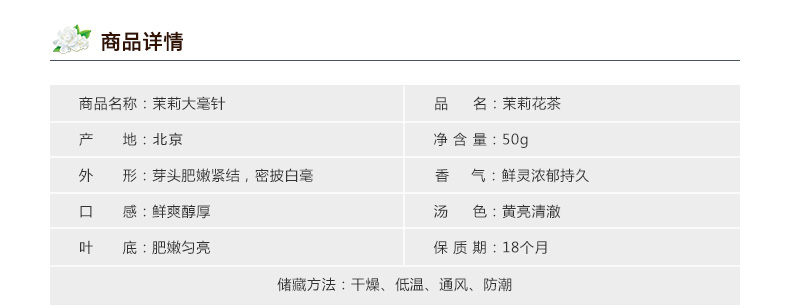 商品名称:张一元 茉莉花茶 花茶 茶叶 茉莉大毫针 80元/50g