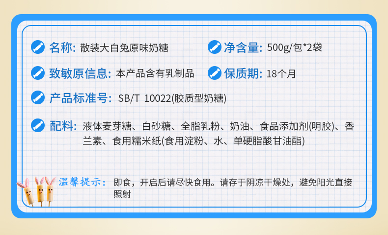 商品名称:大白兔 奶糖500g散装原味*2袋 喜糖结婚婚庆糖果