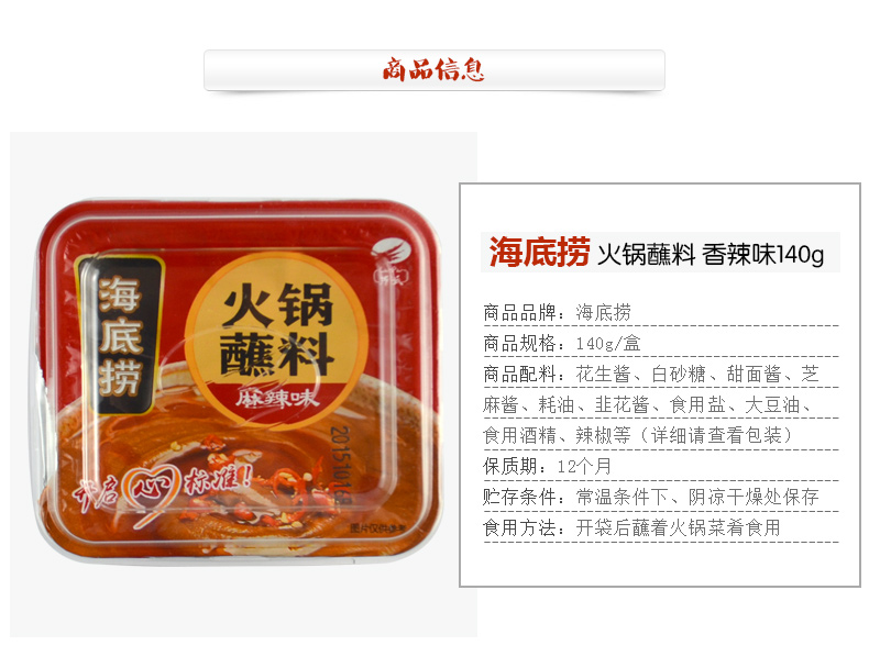 商品名称:海底捞 麻辣味火锅蘸料140g×5四川特产捞派花生芝麻酱盒装
