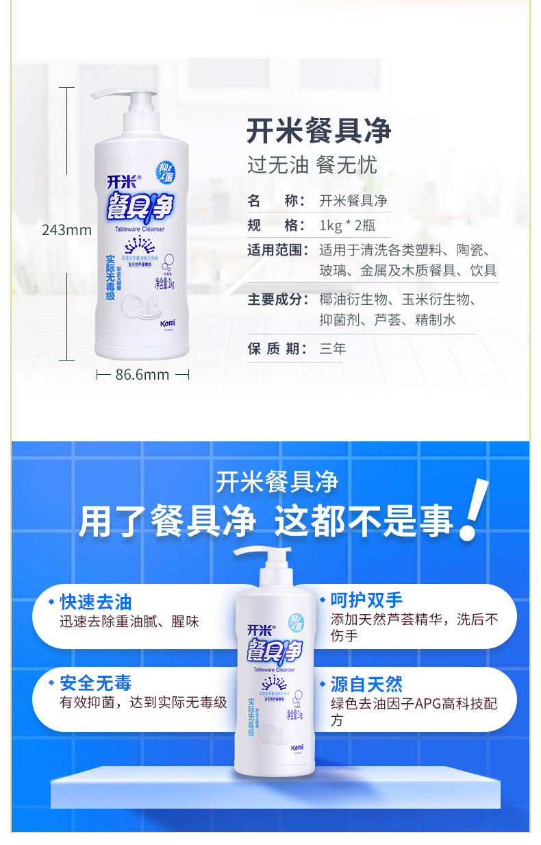 商品名称:开米 无毒无香型餐具净1kg*2+开米厨房油垢净强力油污620g*1组合装