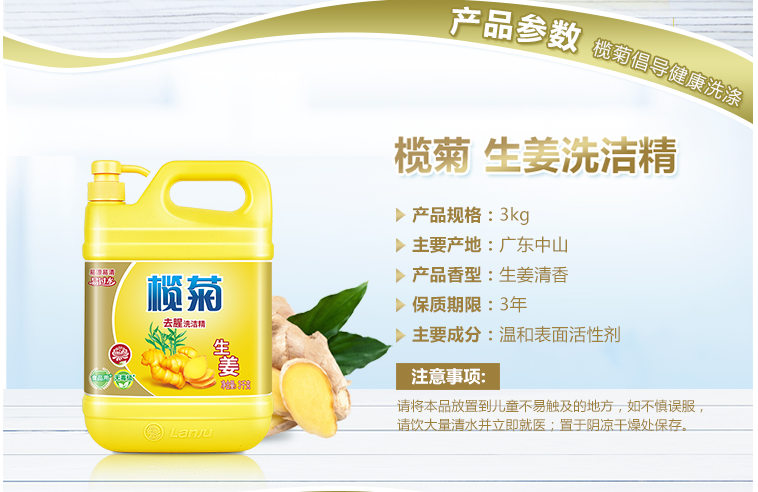 商品名称:榄菊 生姜去腥洗洁精3kg/瓶 食品用蔬果洗涤不伤手去油 祛味