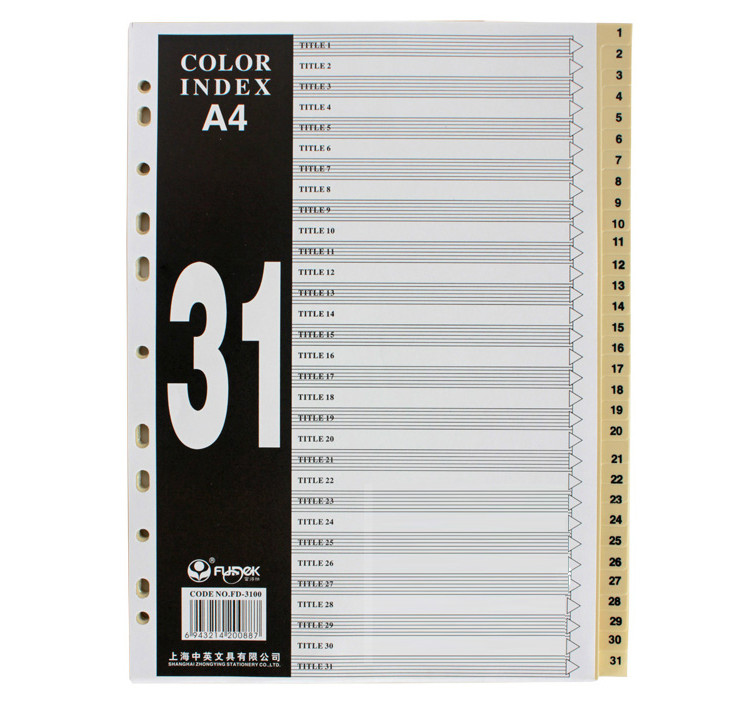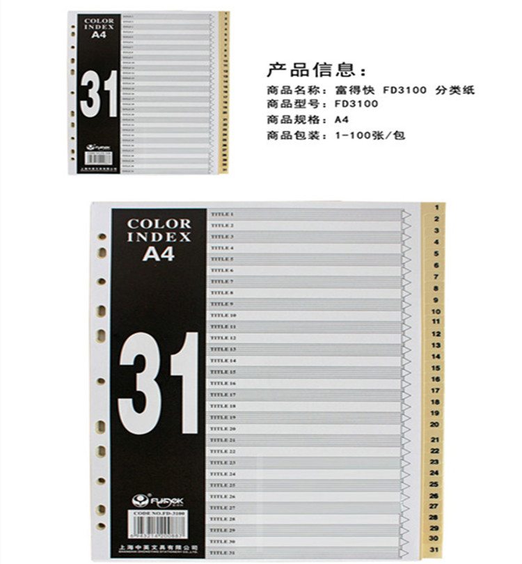 商品名称:富得快 FD3100塑料 分类索引卡 PVC数字1-31页分页纸隔页纸分类纸