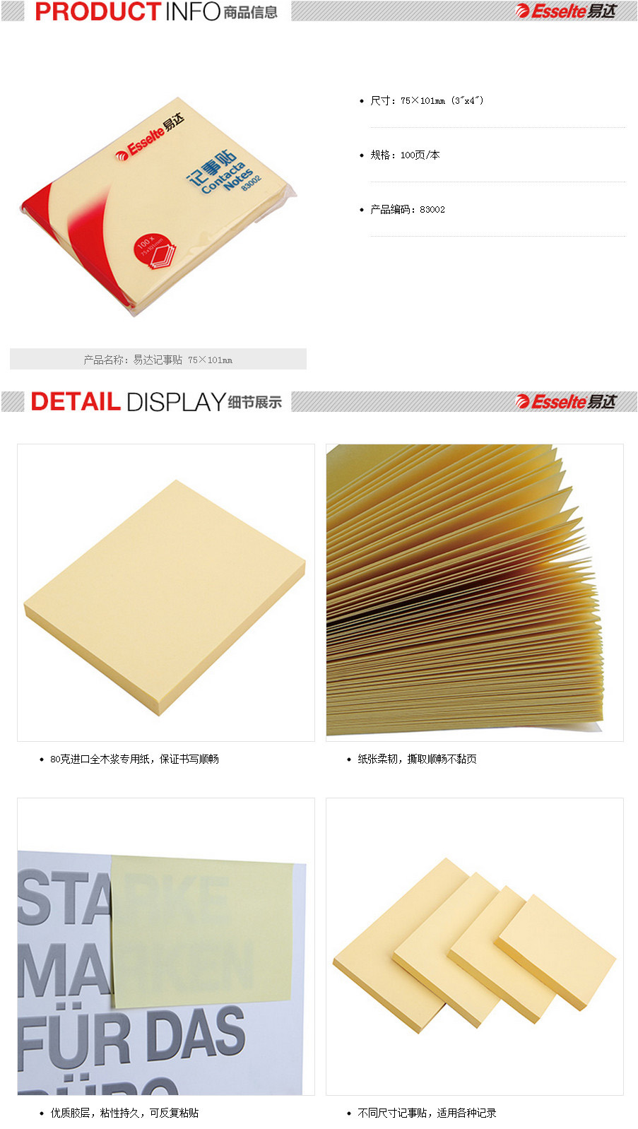 商品名称:易达/Esselte 83002 记事贴 即时贴 N次贴 便利贴 75*101mm