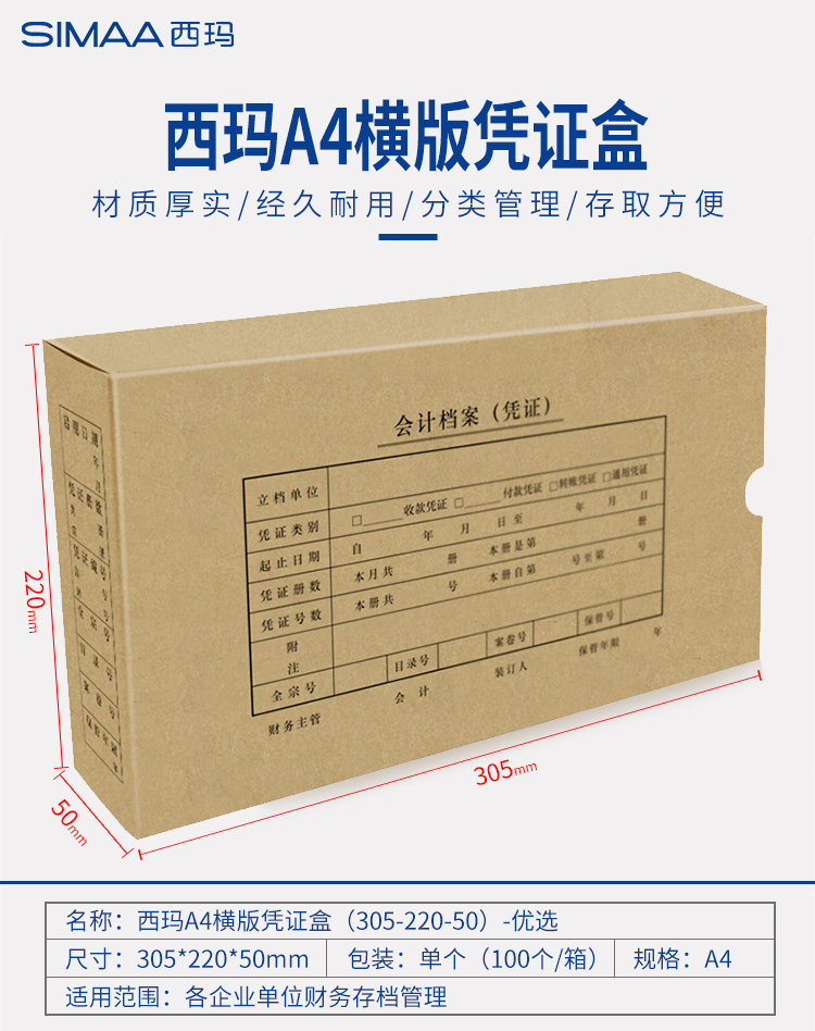 商品名称:西玛 全A4横版凭证盒档案盒 单封口305*220*50mm会计凭证档案盒装订盒子 A4规格装订盒财务会计装订用品 HZ352
