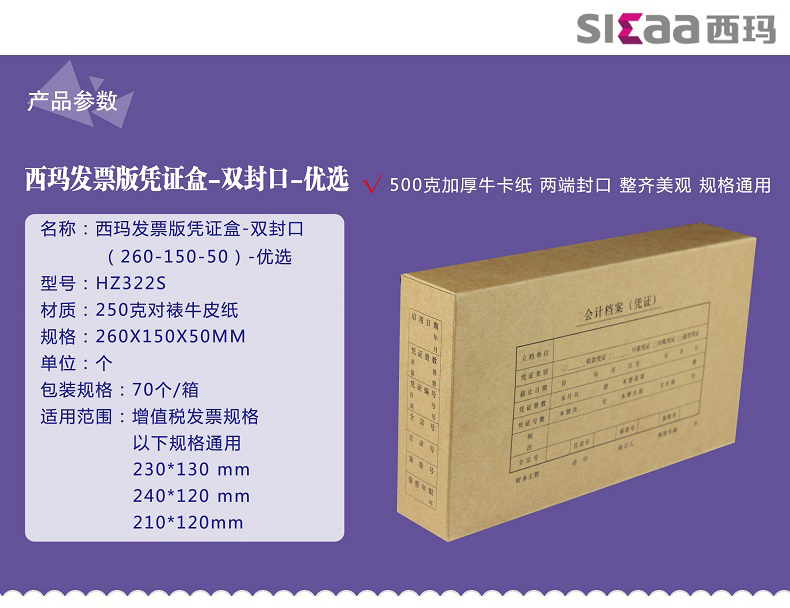 商品名称:西玛 双封口260*150*50财务通用凭证装订盒 财务会计办公用品