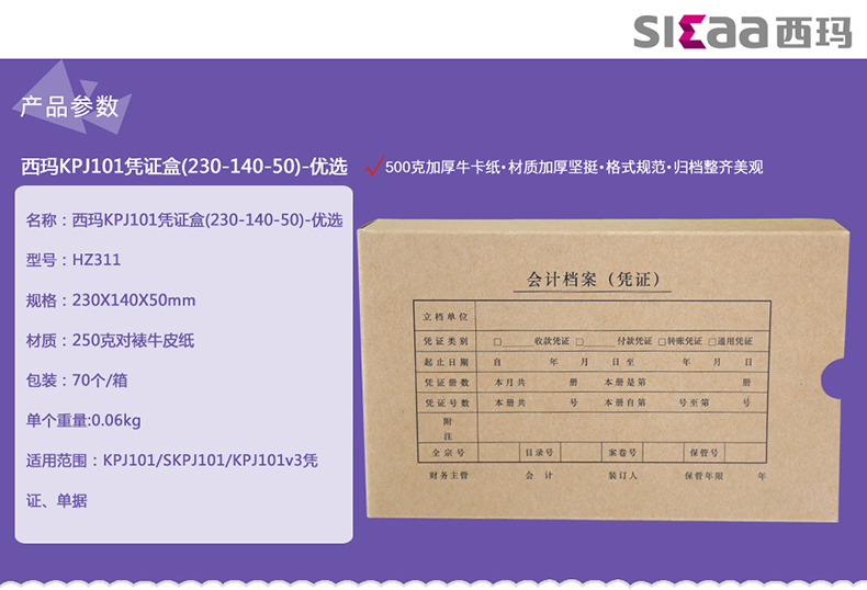 商品名称:西玛 凭证盒KPJ101凭证配套档案盒西玛记账凭证盒会计档案装订盒 财务会计用品 立信金蝶通用 HZ311