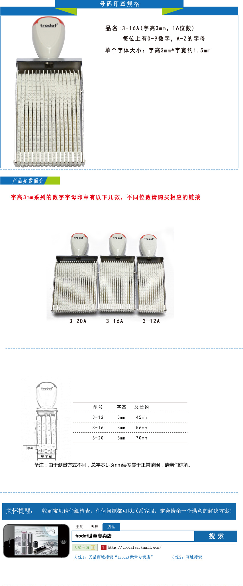 商品名称:Trodat/卓达 3-16A 字高3mm系列活字中英文组合章号码章 转轮印章