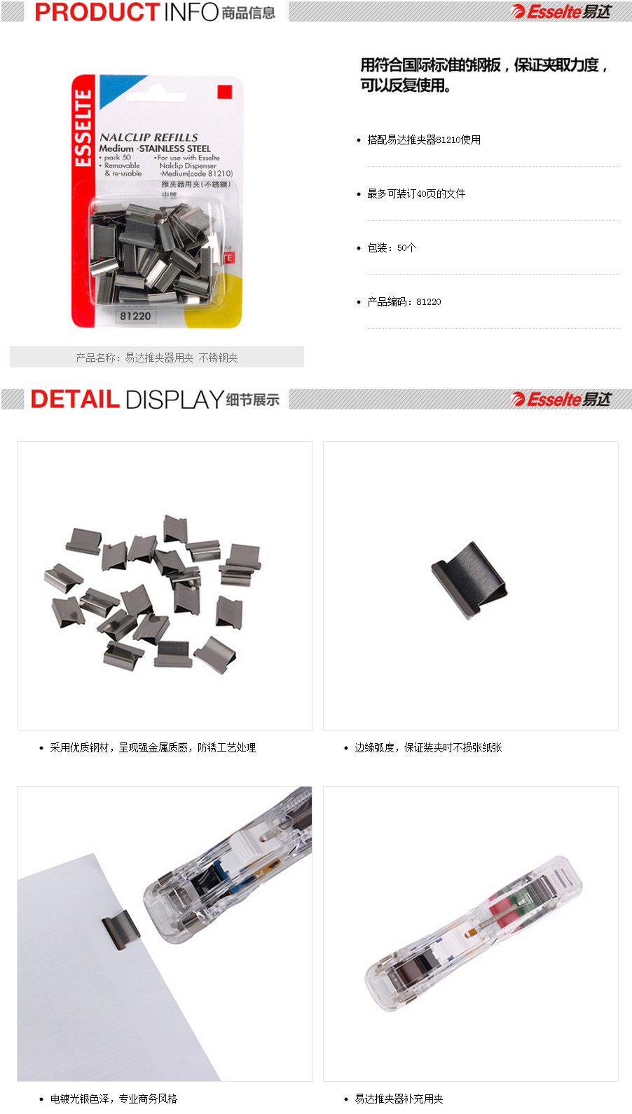 商品名称:易达/Esselte 81220 票夹器用不锈钢装订夹/补充夹(银色)