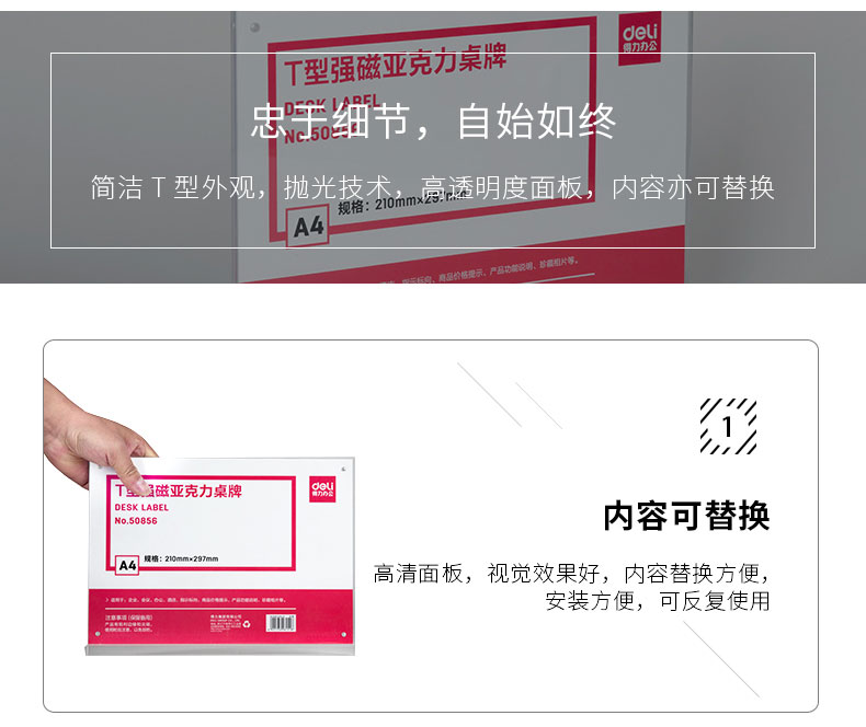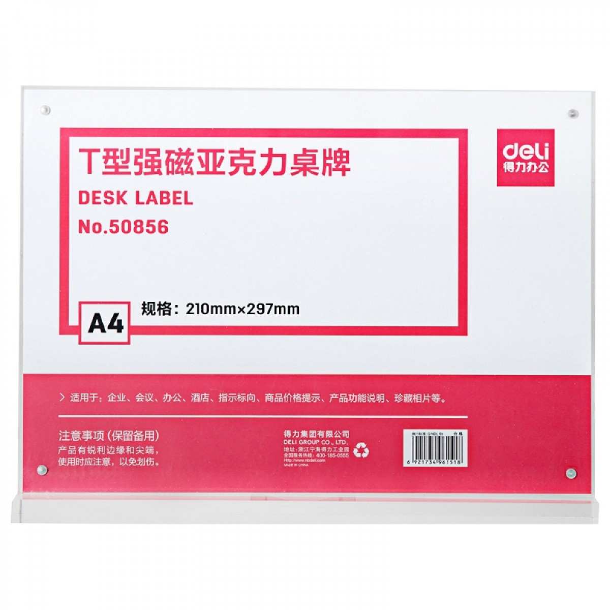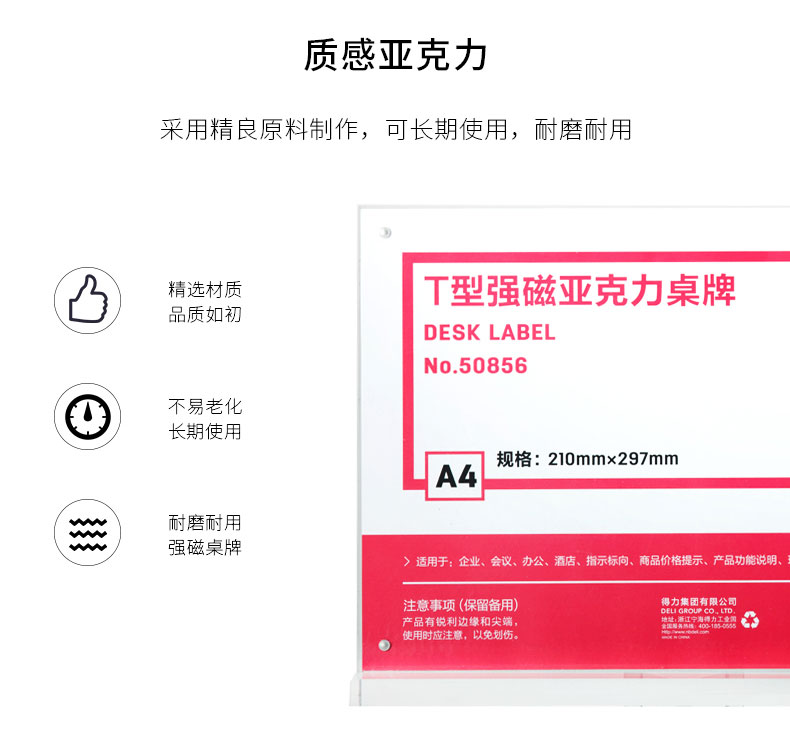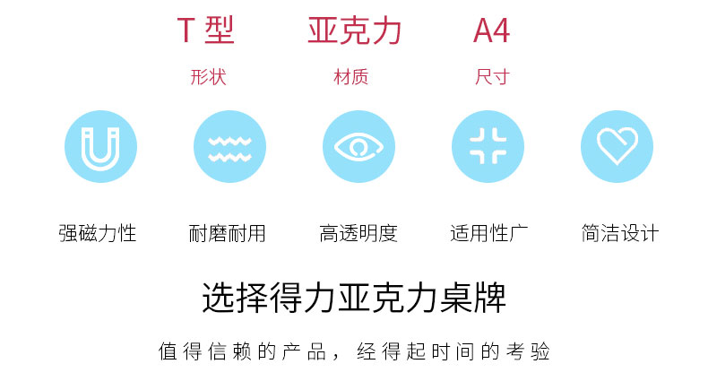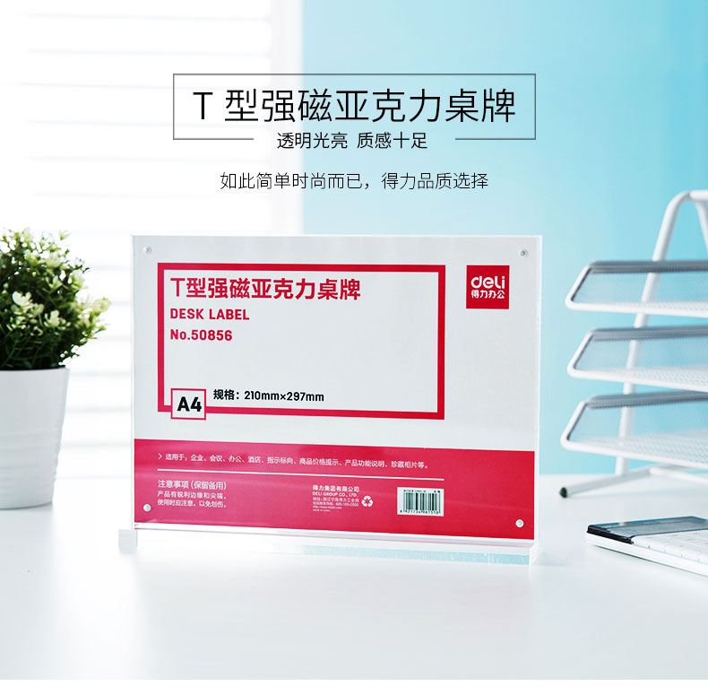 商品名称:得力 50856T型强磁亚克力桌牌A4横式酒店会议展示牌座位透明台卡